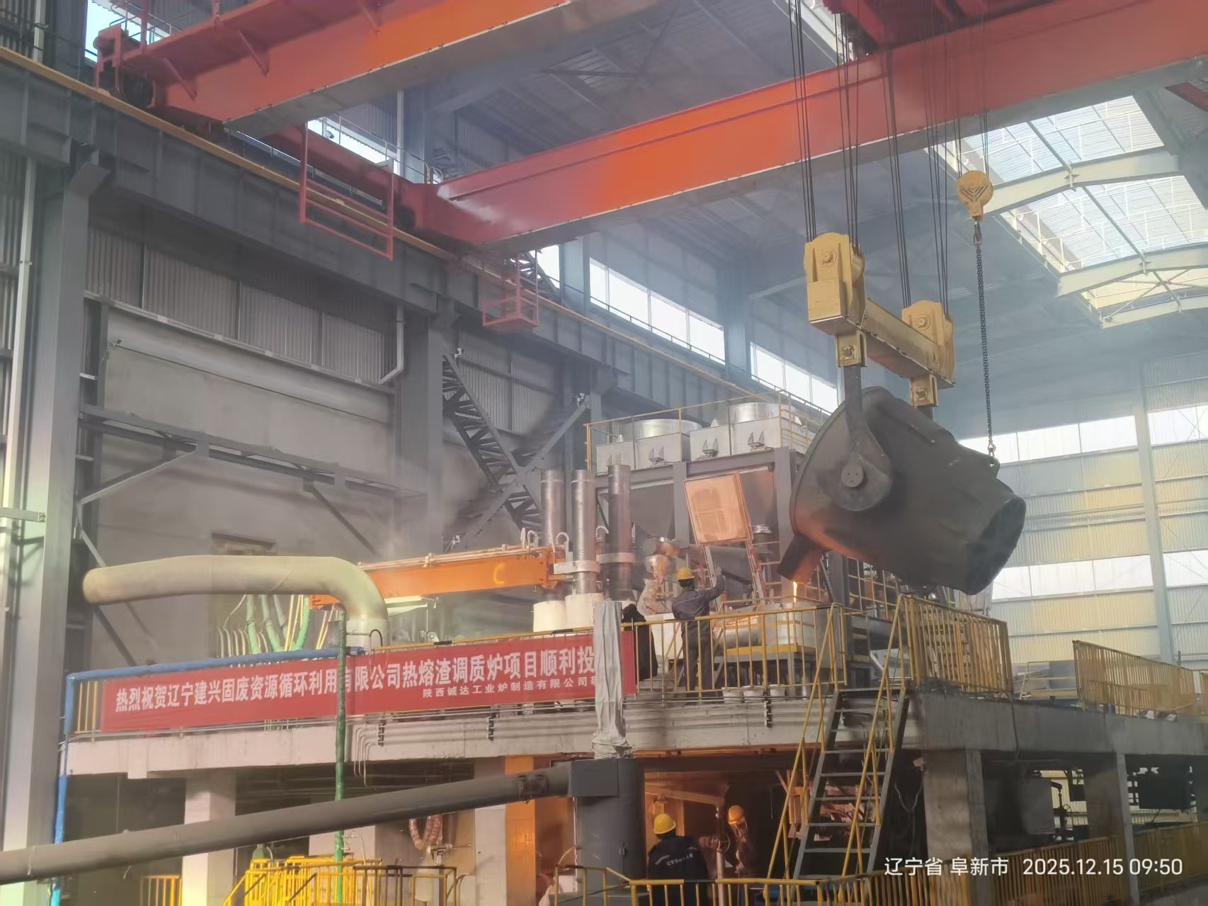 - Прием шлака: 1200-1300°C горячая расплавленная шлака подается в печь через закрытые каналы.